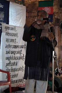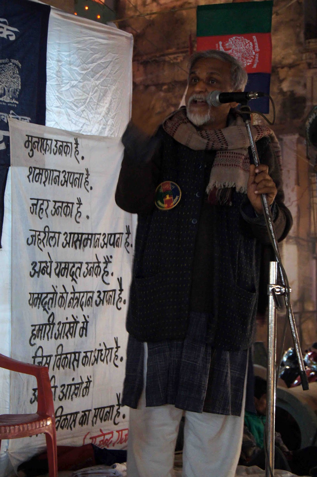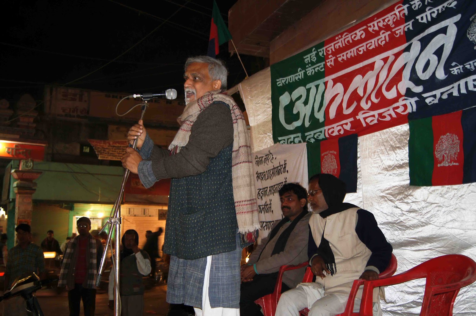 बनारस पहुंचने के दूसरे दिन 12 फरवरी की शाम साथी रोहित प्रकाश को मछली खाने का मन हुआ, तो हम लोग बढि़या मछली की खोज में गोदौलिया से बंगाली टोला की ओर निकले। रात के साढ़े नौ बज रहे होंगे। मछली तो नहीं मिली, लेकिन हम जैसे ही सोनारपुरा चौमुहानी पर पहुंचे, देखा कि अफलातून एक बैनर और कविता के दो पोस्‍टर टांगे एक चौकी पर खड़े हैं और एक माइक हाथ में लिए ज़ोर-ज़ोर से भाषण दे रहे हैं। मैंने स्‍कूटर रोक दिया। सोचा कुछ सुन लिया जाए। ध्‍यान से देखा तो मंच पर तीन लोग थे और मंच के नीचे लगी कुर्सियों पर मात्र चार लोग, जिनमें अफलातून जी की पत्‍नी भी शामिल थीं। बड़ी महत्‍वपूर्ण बातें कर रहे थे अफलातून, लेकिन बनारस की गलियों का जनजीवन एक बुद्धिजीवी की गुहार से बेखबर अपनी मस्‍ती में डूबा हुआ था। लोग आ-जा रहे थे लेकिन किसी ने भी पलट कर देखने की ज़हमत नहीं उठाई। ठीक एक किलोमीटर पीछे मदनपुरा में दिग्विजय सिंह आए हुए थे और वहां लोगों का हुज़ूम उमड़ा पड़ा था।