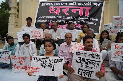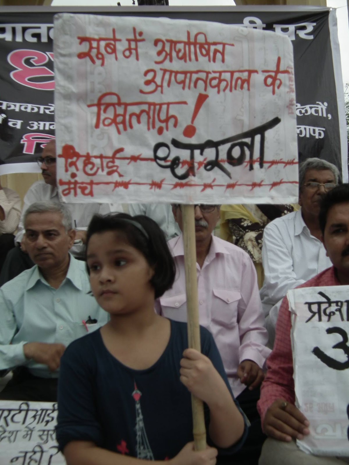 ‘‘आपातकाल की चालीसवीं बरसी पर रिहाई मंच ने दिया धरना… जलाकर मारे गए शाहजहांपुर के पत्रकार जगेंद्र सिंह को इंसाफ दिलाने और प्रदेश में दलितों, महिलाओं, आरटीआइ कार्यकर्ताओं व पत्रकारों पर हो रहे हमले के खिलाफ शासन को सौंपा 17 सूत्रीय ज्ञापन।”