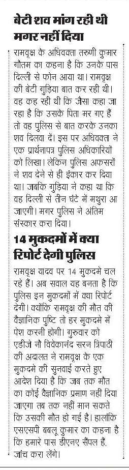 गौतम पहले से ही रामवृक्ष यादव के दो मुकदमे लड़ रहे हैं। प्रशासन ने रामवृक्ष को मृत घोषित कर दिया है, लेकिन गौतम का मानना है कि किसी और की लाश दिखाकर उसे रामवृक्ष बता दिया गया। उनके पास इसका साक्ष्य भी है। वे बताते हैं कि यहां की जेल में हरनाथ सिंह नाम का एक सत्याग्रही बंद है। वह पट्टी पवोरा, थाना तिरवा, कन्नौज का रहने वाला है। पुलिस ने उससे रामवृक्ष यादव की लाश की शिनाख्त करवायी है। गौतम ने 8 जून को हरनाथ समेत तीन कैदियों से मुलाकात के लिए जेल अधीक्षक को लिखित अर्जी दी थी जिसे ठुकरा दिया गया। इसके बाद वे जिलाधिकारी के पास से आदेश ले आए, तब उन्हें मिलने दिया गया। उसमें भी एक कैदी नहीं आया, जो दूसरा कैदी आया वह उनके बताए शख्स का हमनाम निकला और तीसरा हरनाथ ही था। हरनाथ के पैर टूटे हुए थे। उसने गौतम को बताया कि उसे मार-पीट कर दबाव में लाश की शिनाख्त करवाई गई और उसे रामवृक्ष का कहलवाया गया। गौतम को यह तो नहीं पता कि रामवृक्ष जिंदा है या मर गया, लेकिन वे पूरे विश्वास से कहते हैं कि जो लाश दिखाई गई है, वह रामवृक्ष की नहीं है।