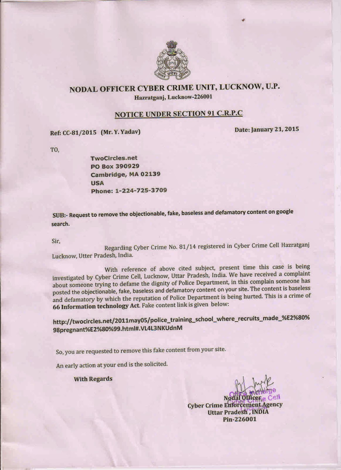 21 जनवरी 2015 को जारी इस नोटिस में उत्तर प्रदेश पुलिस ने कहा है कि उन्हें किसी से शिक़ायत मिली कि कोई पुलिस विभाग के सम्मान के साथ खिलवाड़ कर रहा है और वेबसाईट पर विभाग के सन्दर्भ में तथ्यहीन, आधारहीन, झूठी और अपमानजनक खबर छापी गयी हैं.