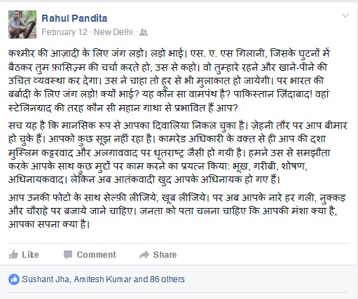 इस पोस्ट का आखिरी वाक्य है- ”जनता को पता चलना चाहिए कि आपकी मंशा क्या है…”। राहुल पंडिता को लगता है कि वामपंथियों को लग्घी से पानी पिलाकर वे अपनी राजनीतिक मंशा को छुपा ले जाएंगे। अब ऐसा नहीं होगा। उन्होंने गलत जगह हाथ डाल दिया है। वामपंथ की आलोचना हम भी करते हैं, बहुत लोगों से कहीं ज्यादा और बार-बार करते हैं, लेकिन इस भाषा में नहीं। राहुल पंडिता की भाषा से जो नफ़रत टपक रही है, वह दिखाती है कि सामाजिक व राजनीतिक आपातकाल में वे किसके साथ खड़े हैं। नफ़रत भर होती तब भी चलता, क्योंकि मेरे कई संघी दोस्त हैं जो वामपंथ से घृणा करते हैं। जेएनयू प्रकरण के दौरान राहुल पंडिता की यह नफ़रत कैसे हिकारत में बदलती है, उसका नमूना देखें: