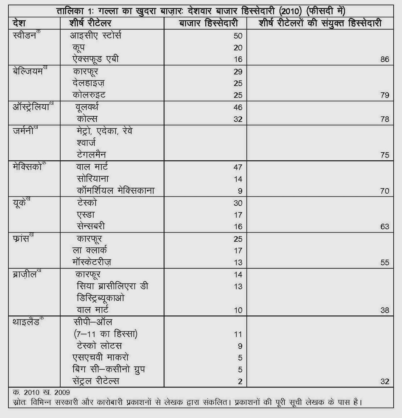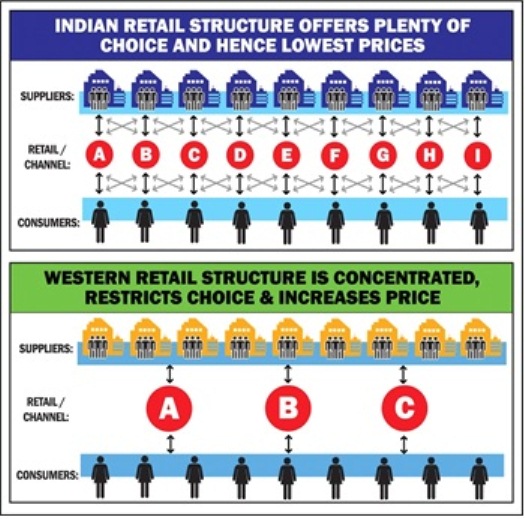 फिलहाल भारत में खुदरा बाजार का ढांचा पश्चिम का ठीक उलटा है जहां किसी भी एक कंपनी का बाज़ार के किसी सेगमेंट पर कब्जा नहीं है। बहुराष्ट्रीय खिलाड़ी पैसे की ताकत और दुनिया भर से उत्पाद खरीद सकने की अपनी क्षमता के चलते यहां यह मॉडल थोप सकते हैं। इस प्रक्रिया में लाखों नौकरियां जाएंगी, अकेले स्वरोजगार वाले क्षेत्र या छोटी दुकानों में नहीं बल्कि कॉरपोरेट रीटेल क्षेत्र में भी, क्योंकि वालमार्ट जैसे बड़े रीटेलरों का हमला झेल पाने में वे खुद को नाकाम पाएंगे।