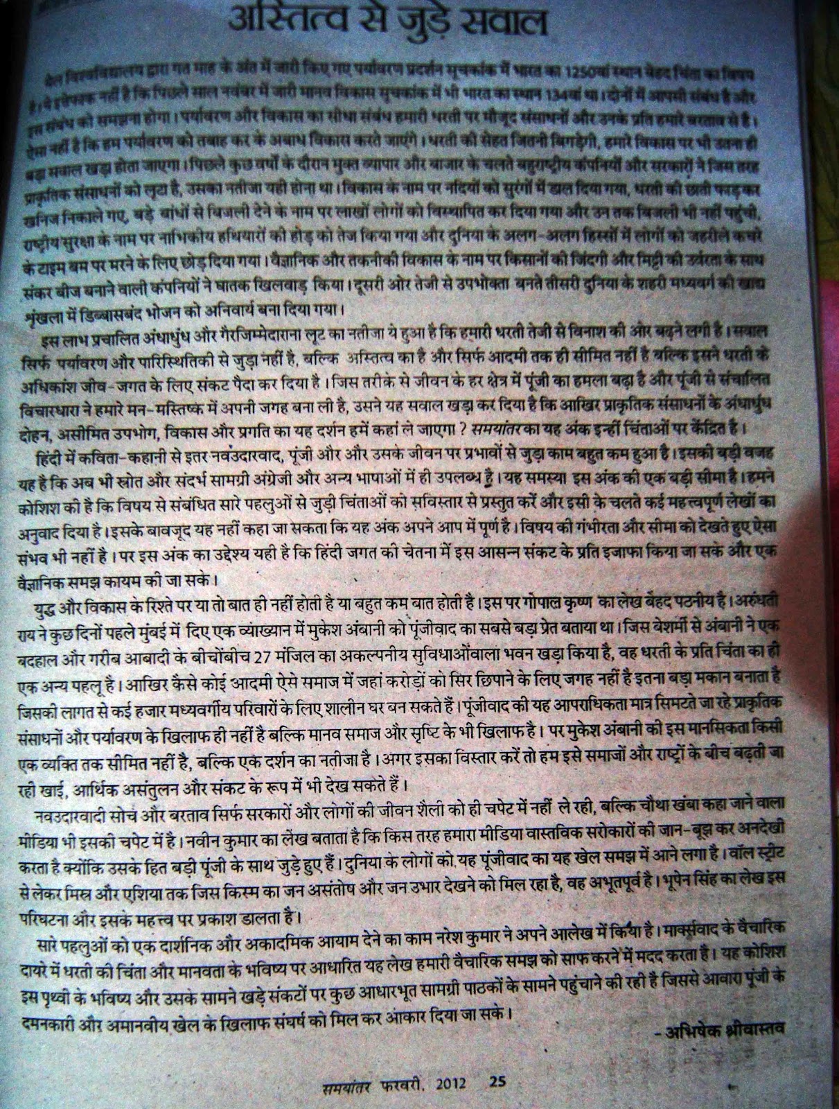 हिंदी की वैचारिक पत्रिका ‘समयांतर’ का फरवरी विशेषांक ‘विकास बनाम अस्तित्व’ निकालने की जि़म्मेदारी इस बार मुझे दी गई थी। अंक अब बाज़ार में आ चुका है और उसमें अतिथि संपादक की जगह मेरा नाम किसी रामाज्ञा शशिधर के साथ डाला गया है। इसकी सूचना मुझे अंक के प्रेस में जाने से एक दिन पहले दे दी गई थी, इसलिए संपादक / स्वामी की स्वतंत्रता के लिहाज़ से इस पर सवाल उठाने का कोई अर्थ नहीं, हालांकि जनवरी अंक में अतिथि संपादक के तौर पर मेरे नाम की ही लिखित घोषणा की गई थी। बहरहाल, इस अंक के लिए मैंने जो संपादकीय लिख था, उसे संपादक पंकज बिष्ट ने लौटा दिया था और सीधे विषय प्रवर्तन करने वाला एक संपादकीय लिखने को कहा था। बदला हुआ संपादकीय तो आप पत्रिका में पढ़ ही सकते हैं जो मूलत: अंक की विषयवस्तु के परिचय से ज्यादा कुछ नहीं। मूल संपादकीय मैं नीचे डाल रहा हूं जिसे लिखने में मुझे काफी वक्त लगा था। चूंकि अंक बाज़ार में आ चुका है, लिहाज़ा इस संपादकीय को सार्वजनिक करने में मुझे कोई नैतिक दिक्कत नज़र नहीं आती, दूसरे किसी न किसी रूप में तो इसका उपयोग होना ही चाहिए।